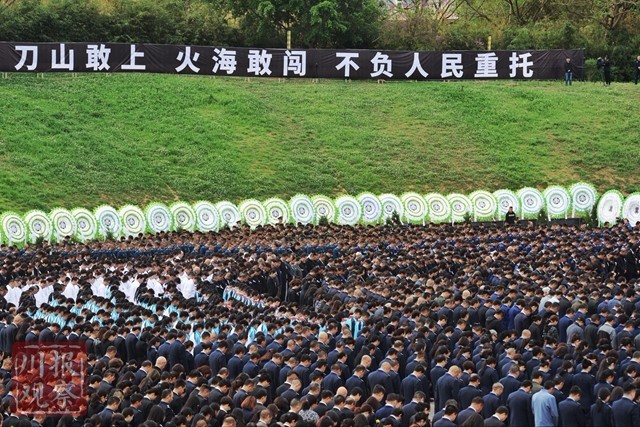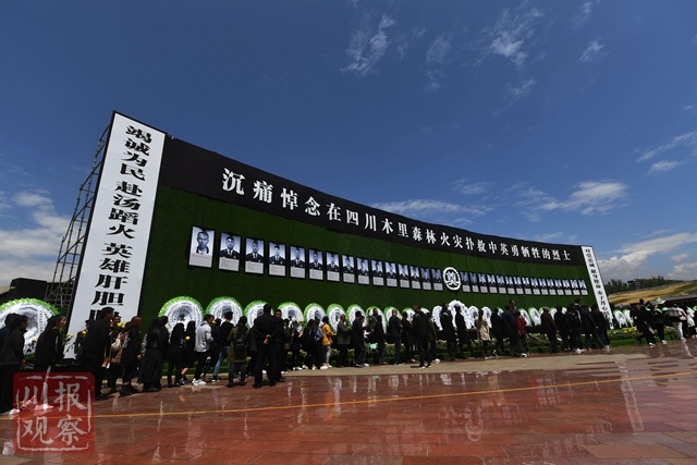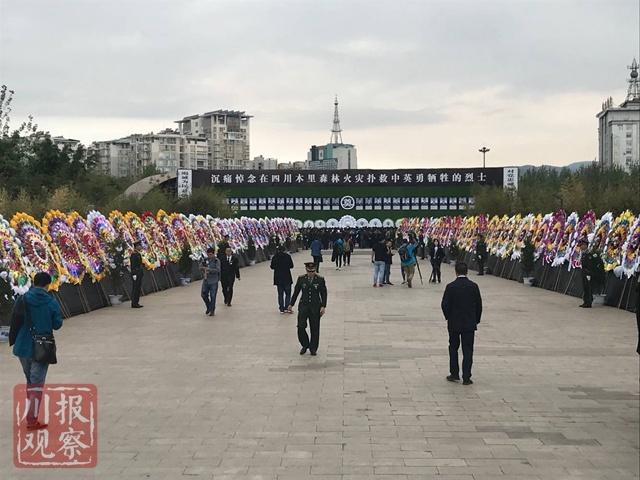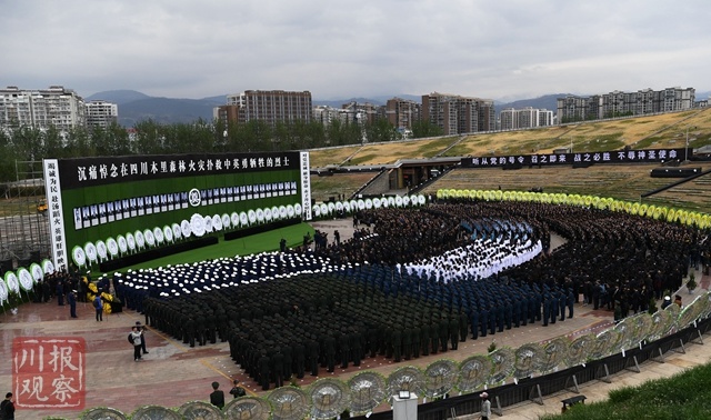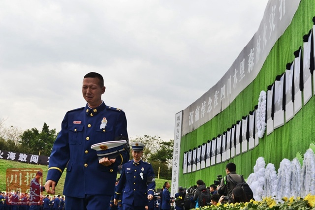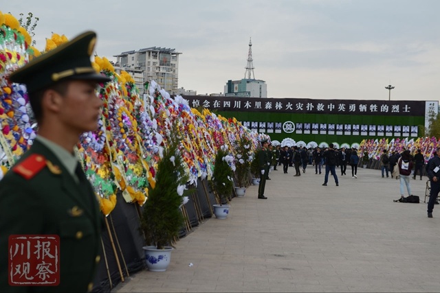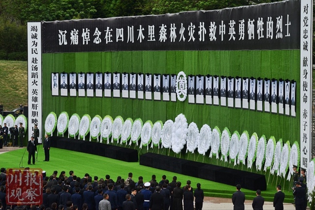 追悼会正面祭礼台上方写着:“沉痛悼念在四川木里森林火灾扑救中英勇牺牲的烈士” 几个大字。