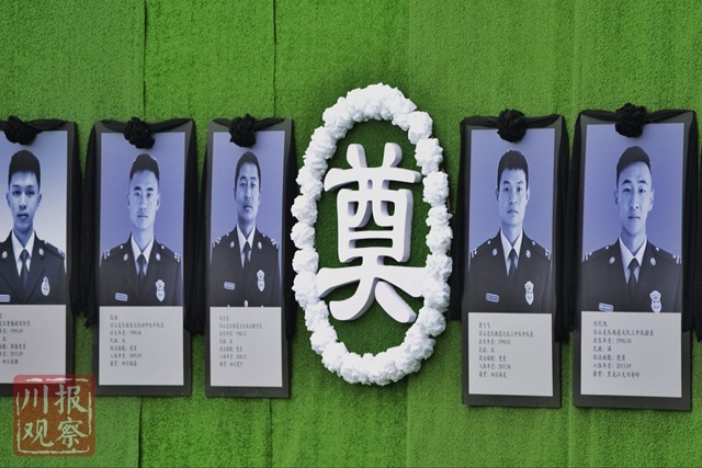 绿色祭礼台幕墙中央,黑底白字书写着“沉痛悼念在四川木里森林火灾扑救中英勇牺牲的烈士”20个大字,下面悬挂着30位英烈的遗像,两边挂着着挽联“对党忠诚 献身使命 赤子丹心昭日月 竭诚为民 赴汤蹈火 英雄肝胆映山河“。