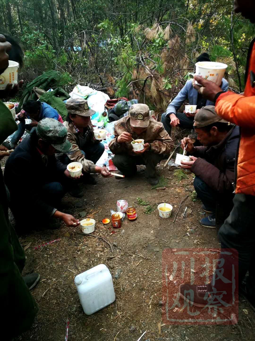 上图:4月8日,木里森林火灾现场,木里县村民扑火队充饥。