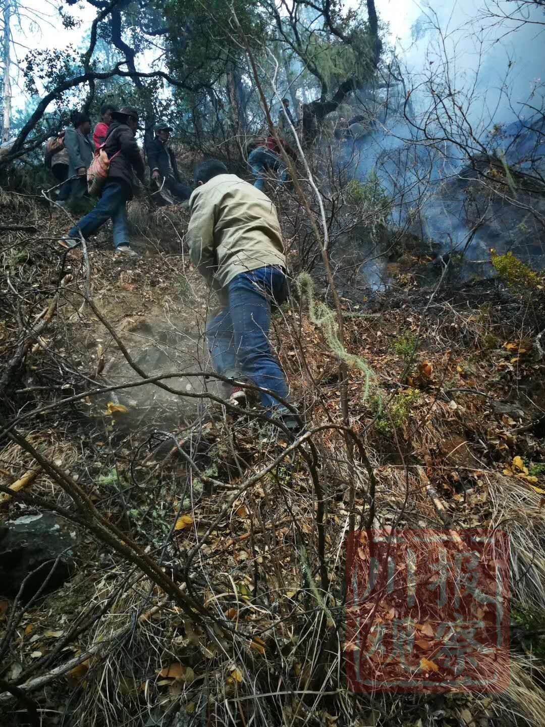 上图:4月8日,木里森林火灾现场,木里县村民扑火队正在扑火。