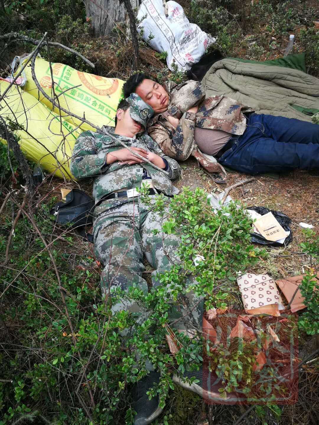 上图:4月8日,木里森林火灾现场,木里县村民扑火队休息。