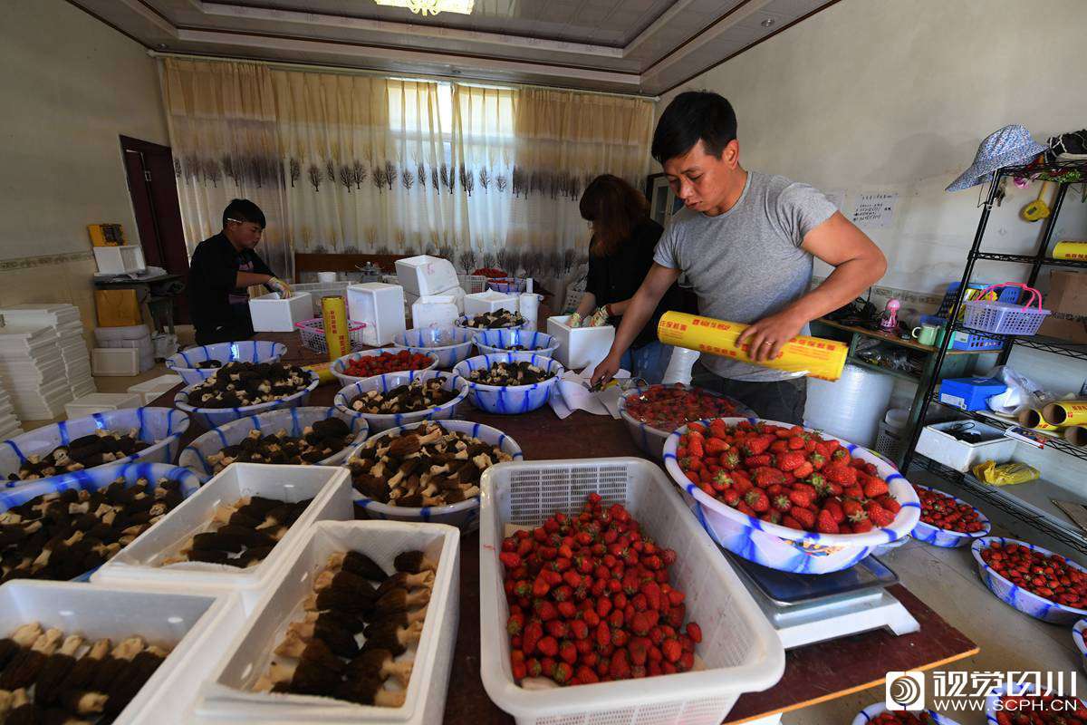 基地包装车间内,工作人员打包着村民们采摘来的草莓和羊肚菌,准备发往全国各地。