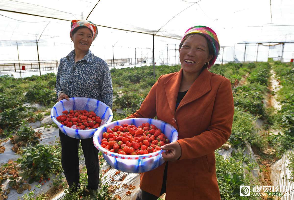 基地内,草莓已进入采摘期,村民们在此快乐工作。