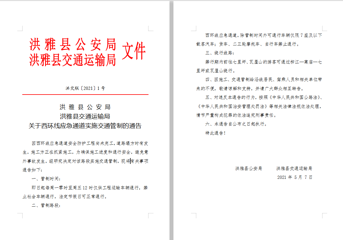 洪雅县交通运输局提醒:禁行期内,从洪雅方向前往七里坪、瓦屋山的游客可通过柳江—高庙—七里坪或瓦屋山绕行。