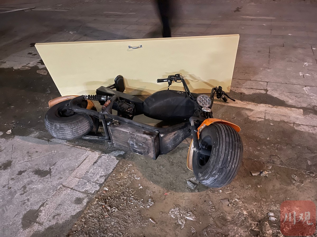5月10日晚11时,川观新闻记者来到成华区丛树家园小区,看到事发爆燃的电瓶车倒放在地上。