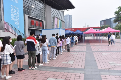 接种期间,学校领导也到现场视察工作,关心接种师生,慰问现场医务人员,了解现场医护人员的安排情况。现场师生们全程佩戴口罩,手持身份证、《现场流程单》和《新冠知情告知书》,按照一米线距离有序排队,在志愿者的引导下进入体育馆。随后,师生们走进信息登记区,预检医生根据疫苗接种要求,逐条告知接种对象疫苗接种禁忌症及接种注意事项,建立个人接种档案和填写知情同意书。