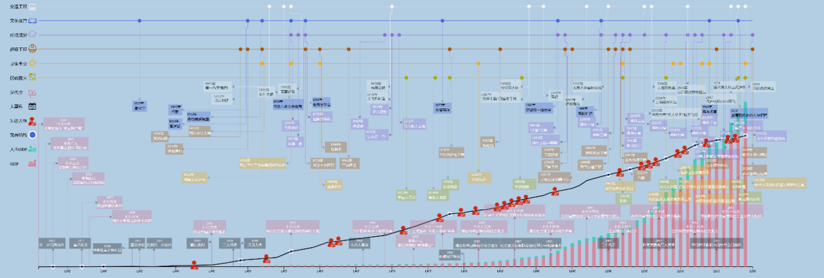 网站支持“总览+细节”的交互方式,通过鼠标就可以轻松实现所有功能:点击图标就能展示或隐藏任意事件和数据的详细描述,比如点击党员发展趋势线上的节点就可以展示不同历史时期的党员总体数量和岗位分布,点击红色人物图标就可以展示不同时期涌现出的时代楷模及事迹,鼠标悬浮于堆积柱状图能够看到历年总GDP、人均GDP等经济建设成果等。