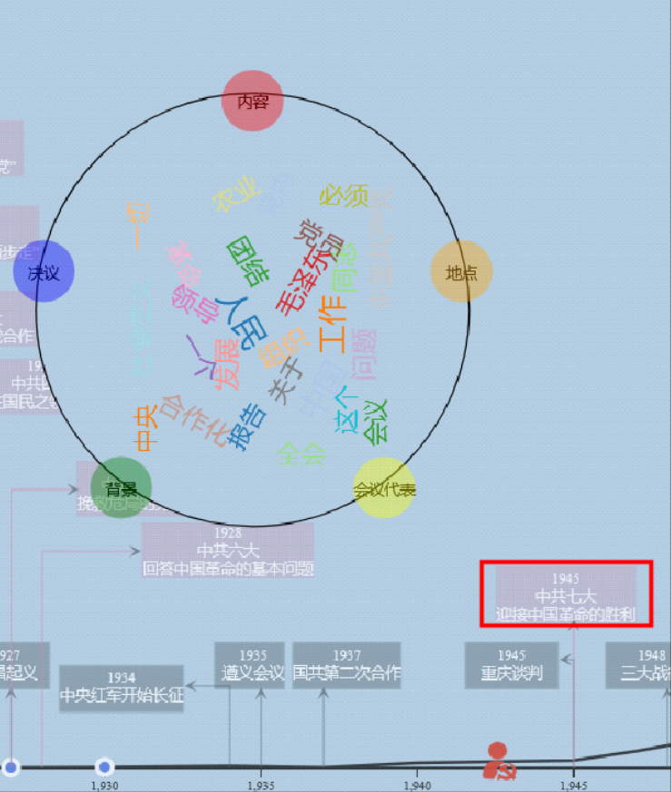 党史故事线(以中共七大为例,结合词云从地点、内容、决议、背景和会议代表等方面呈现会议细节)