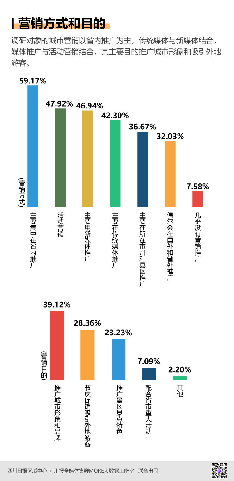 知道了“流量”的重要性,超过90%的区县都在营销上下功夫。但通过对比分析发现,各地营销主要集中在省内及市州,仅有三成受访者表示偶尔会“走出去”。另一方面,当询问营销推广的主要目的时,近四成受访者表示是为了推广城市形象和品牌,三成的人希望通过节庆促销吸引外地游客,两成的人认为是推广景区景点特色。地方政府、行业部门和景区等不同角色对于营销的目的还未形成共识。
