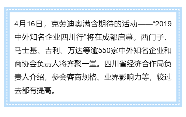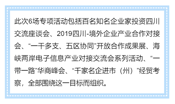 这位负责人介绍,此活动将组织客商实地考察全省五大经济区,“参加人数已超千人,但只要客商愿意,我们可以打破预设,尽量安排。”重内容而不图虚名、重实效而不拘泥形式,是“2019中外知名企业四川行”活动遵循的“刚性原则”。“若不符合这个‘刚性原则’,那些冗长的、形式化的内容,都要砍。”该负责人表示。
