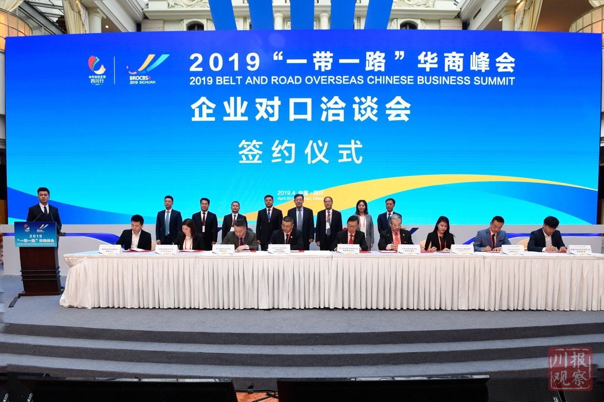 4月16日上午,2019“一带一路”华商峰会首场活动——企业对口洽谈会上,侨资企业和成都市极米科技有限公司、成都中建材光电材料有限公司等川企现场签约,助力“四川造”科技产品“走出去”。