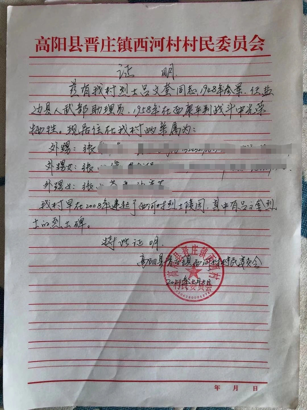 4月8日,一张盖有高阳县晋庄镇西河村支部公章的证明,通过微信传到了胡正春手上。“上面详细列出了吕文魁烈士外甥、外甥女等人的身份证及电话号码,同时附有烈士家乡为吕文魁等21名外出失联的烈士修建的名字碑陵园照片。”