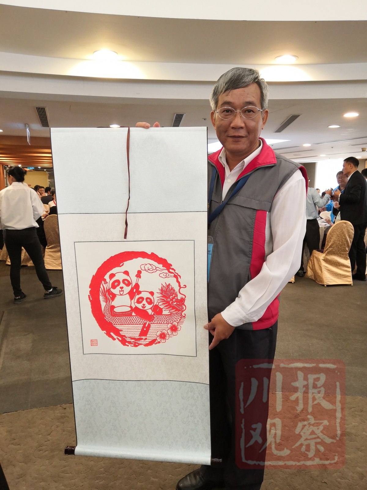 台湾苗栗县农会总干事梁召明在展示新津剪纸