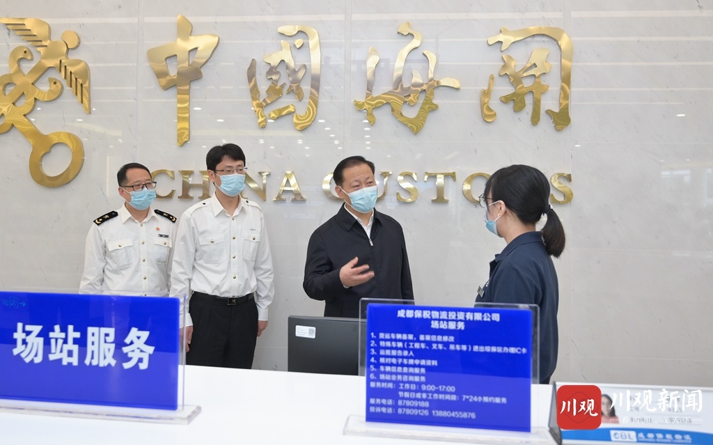 调研中,彭清华来到成都高新综合保税区B区自助服务大厅,与工作人员和办理业务的企业人员亲切交谈,详细了解综保区建设布局、企业招引、业务办理、服务保障机制创新及成都市开放口岸建设情况。