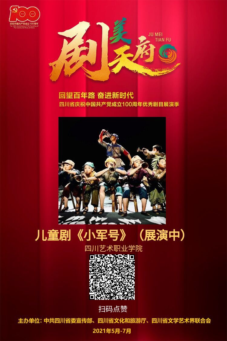 据了解,该剧已入选“剧美天府”回望百年路 奋进新时代——四川省庆祝中国共产党成立 100 周年优秀剧目展演季名录,以优异成绩向中国共产党建党100周年献礼,据悉将在全国开展巡演40余场,并有望在六一国际儿童节期间再次演出,给更多观众带来儿童视角的“红色浪漫”。此外,《小军号》也参加了由中共四川省委宣传部、四川省文化和旅游厅、四川省文学艺术界联合会指导,四川省锦城艺术宫支持,四川日报报业集团、四川省演出娱乐行业协会联合发起——“我心目中最喜爱的红色剧目”网络评选活动,目前平台点赞量超10万,名列前茅,感兴趣的朋友可以扫描下方二维码为它点赞,表达对创作团队的支持。