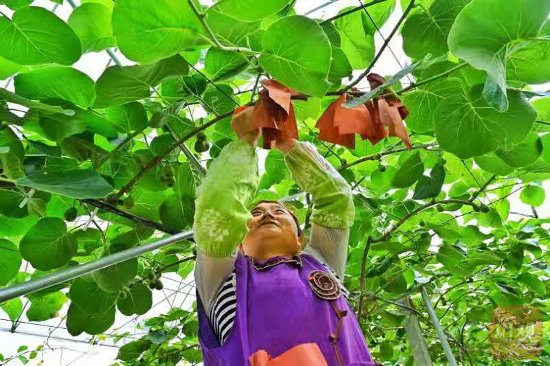 车停由浙江三门出资建设的红心猕猴桃亭子基地,放眼望去,一根根支架搭建而成的白色大棚下猕猴桃树遍布山坡,三三两两的工人们正在地间忙着给鸡蛋大小的猕猴桃穿上褐色的“新衣”。套袋后,后续只用做好简单的管理,待8月下旬成熟后就可以上市了。
