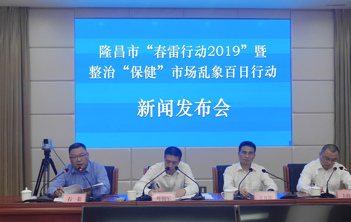 4月18日下午,隆昌市举行“春雷行动2019”暨整治“保健”市场乱象百日行动新闻发布会。记者从发布会上获悉,本次行动于1月11日启动,为期100天,行动中,隆昌市除紧扣“亮剑市场监管,护航经济发展”的主题外,还结合隆昌实际增加了“农村假冒伪劣食品专项整治行动”、“打击商标侵权行为专项行动”和“餐饮服务食品安全专项整治行动”三个执法子行动。