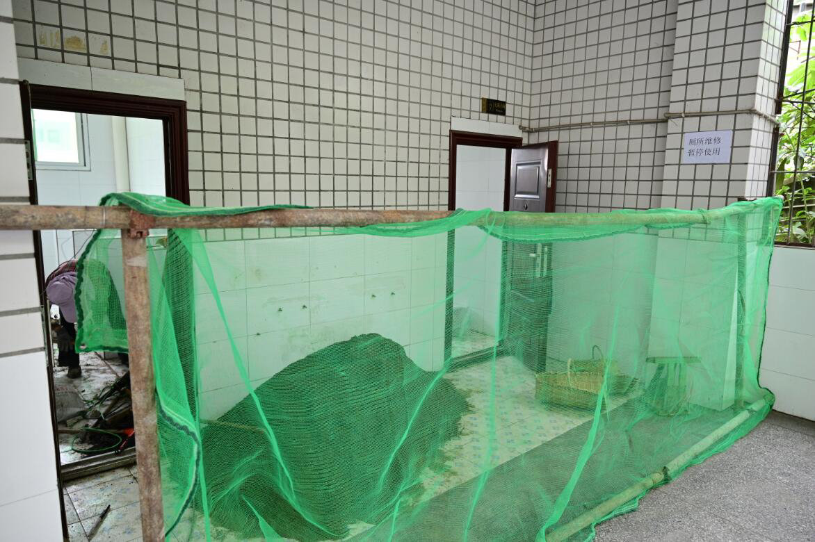 在该校教学楼需要整改的厕所门口,均贴着“厕所维修 暂停使用”的提示语,并搭起了绿色的安全防护网,围住了正在维修的厕所。每间厕所内,都有一名工人在清理疏通蹲位中的沙石。