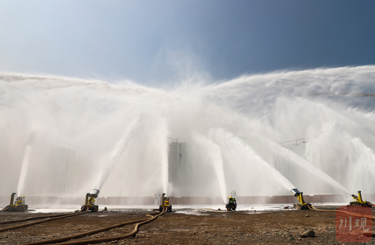 10台消防机器人先后到达指定点位、快速喷射泡沫以抬高射流的姿态对起火罐进行冷却灭火。 冷却灭火过程中,消防机器人全程确保灭火用剂准确、高效的喷射到着火罐,有效阻止火势蔓延。