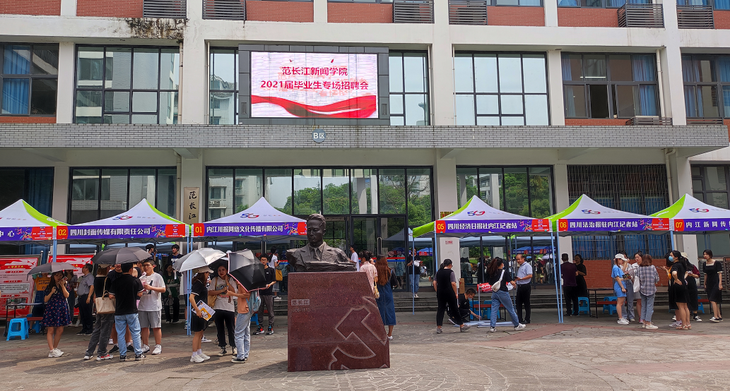 5月14日下午,内江师范学院范长江新闻学院2021届毕业生招聘会举行,这是该学院首次举办毕业生专场招聘会。当天,共有四川日报内江全媒体中心、封面新闻、内江各县区融媒体中心等17家新闻媒体及相关行业单位到现场招聘。