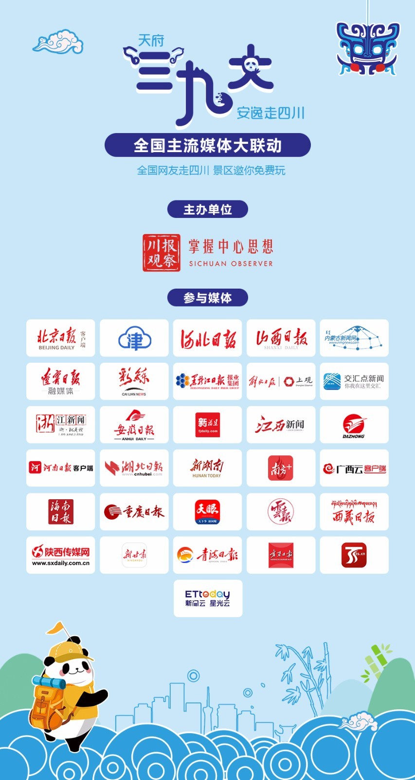 即日起,四川日报川报观察推出“四川@全国 安逸走四川 三九大邀你免费玩”全国主流媒体大联动!旗下两微一端联动全国30多家主流媒体,一起向全国网友派发四川顶级景区门票大礼包!
