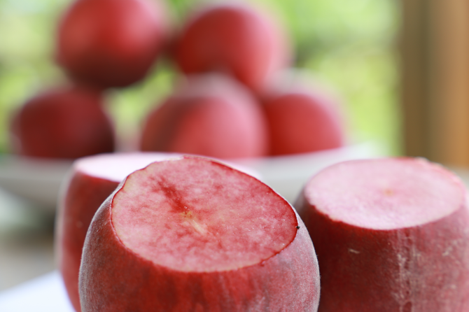 夏满蜜桃因在立夏至小满的时节成熟而得名,属特早熟品种,果肉呈红色,闻起来香,吃起来脆,水分充足。其糖分含量为12.5%,高出其它蜜桃4%至6%。