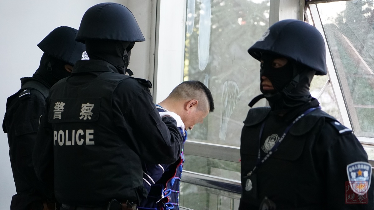 当天上午约9点,一辆警车拉着警笛向凉山州中级人民法院驶来。罪犯阿有土黑被法警带下警车。
