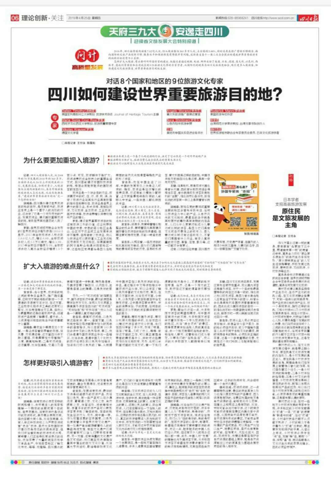 怎样扩大入境游,有必要听听外国专家的建议。本报记者通过视频、电话、邮件采访了美国、日本、德国、意大利、以色列、西班牙、奥地利等国家和台湾地区的9位旅游文化界的专家学者,从国际化的视角为四川文旅深度融合,吸引更多入境游客,加快建设文化旅游强省、世界重要旅游目的地支招。
