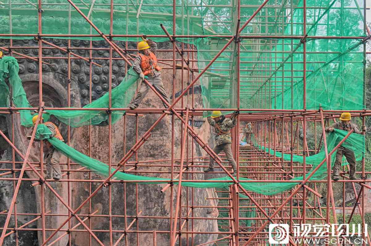 ☛ 2018年12月13日,技术人员用防护网包裹住大佛头部,当日大佛本体已被遮掩正式进入全面“体检”。