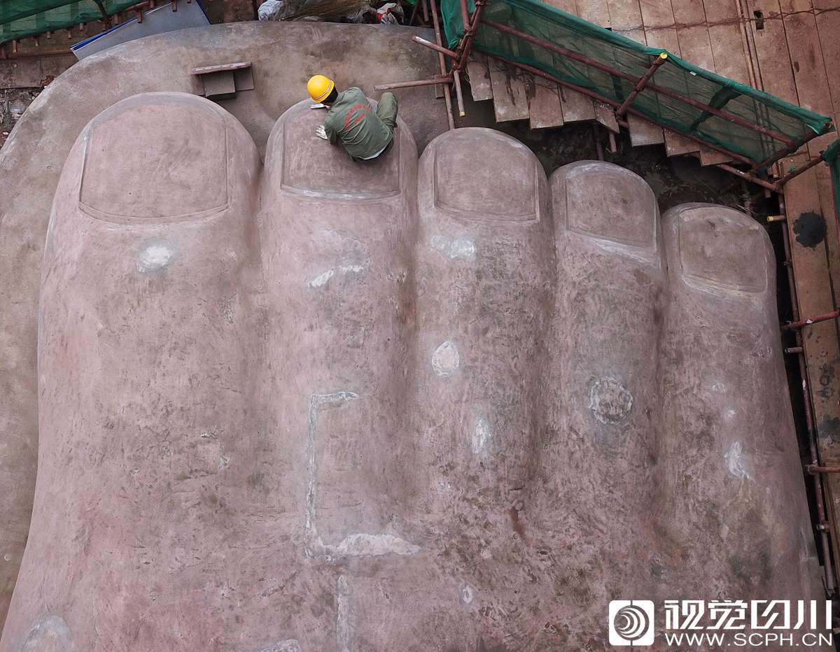 ☛ 2019年3月17日,技术工人正在处理大佛脚部被雨水侵蚀的表层,他用时3天才完成一只脚的处理工作。