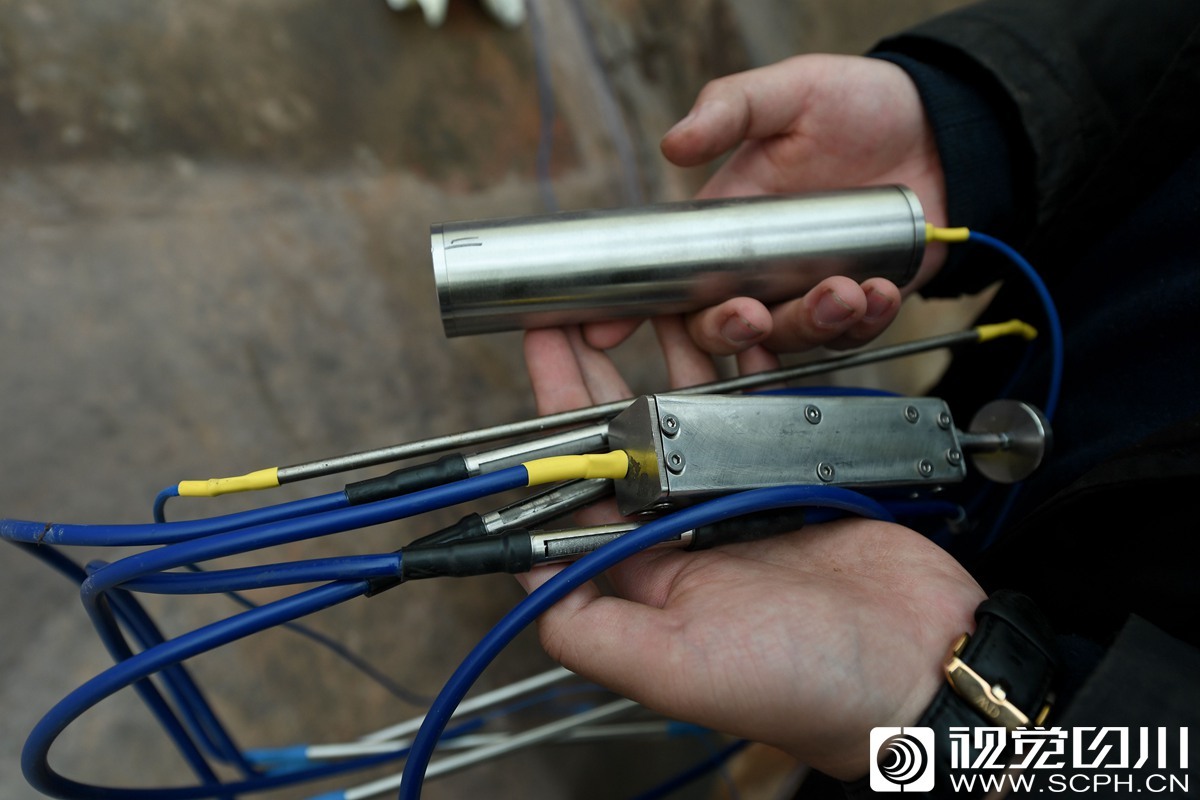 ☛ 2019年3月17日,技术人员展示光纤光栅渗压计和位移传感器,这个设备也是首次用在文物保护上。