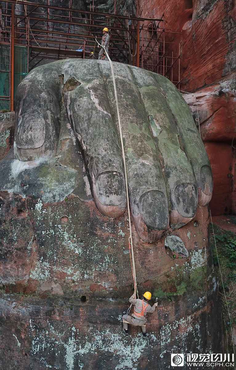 ☛ 2019年3月24日,技术人员身穿保险绳对大佛手部生长的植被进行清理,以保证体表不被侵蚀。