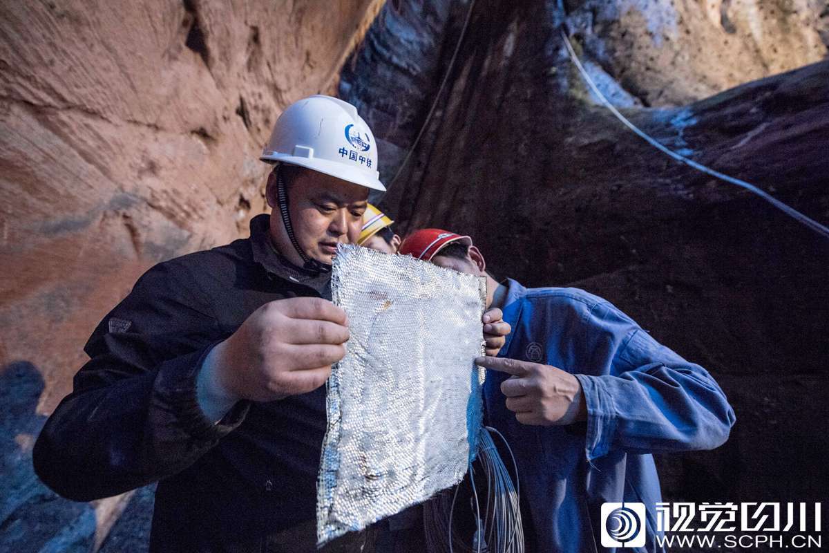 ☛ 2019年4月15日,技术人员正在研究光纤土工布传感器安装位置,希望能更全面的检测大佛表面植物的生长情况。