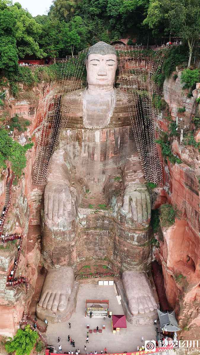 4月23日晚,最后一块位于大佛左侧的脚手架被技术人员拆除,经过200天闭关整容的大佛,焕然一新。 今天,历经千年风雨的大佛风采依旧,等着游客的到来。