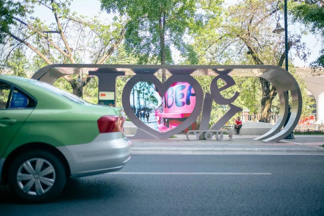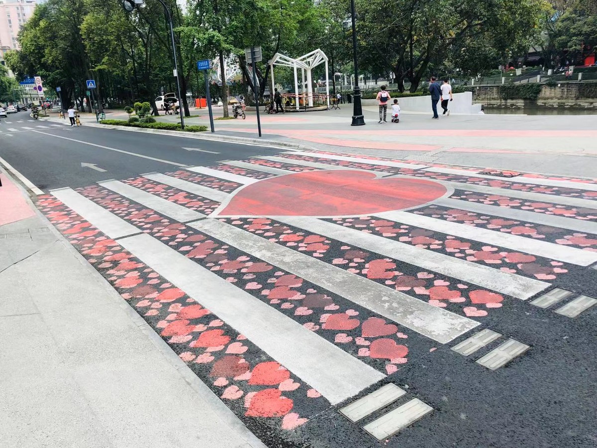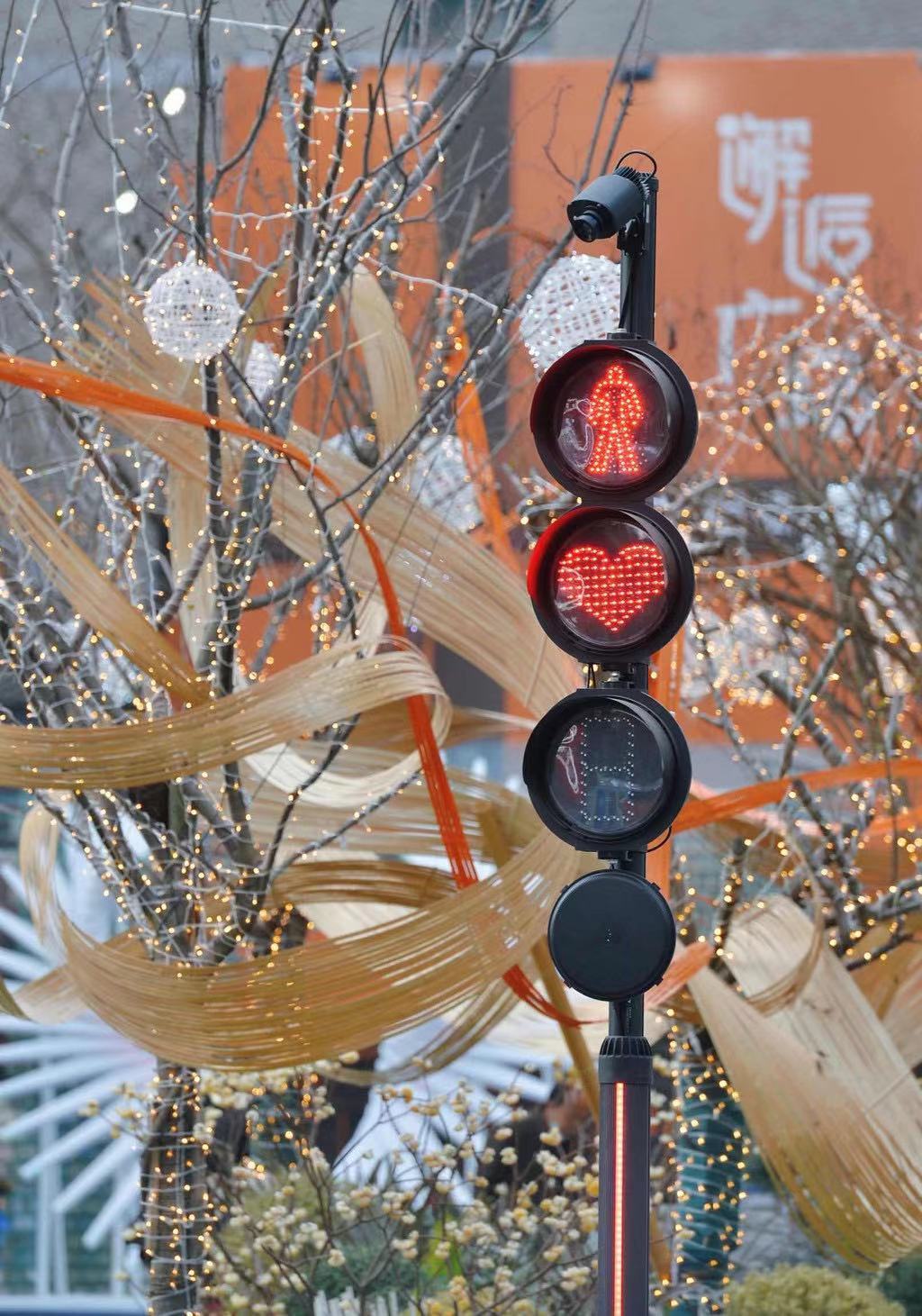 从太古里经过东门码头,再到九眼桥、合江亭,意喻着一生一世的“1.314公里爱情专线”上串联了春熙潮购、玉成缘起、邂逅广场、四季花街、东门码头、天仙桥会、繁花市井、兰桂品香、合江听涛、九眼桥醉等场景,这里处处都是爱意,处处都是甜蜜,连红绿灯、斑马线、公交站台等被设计成了“爱”的形状。