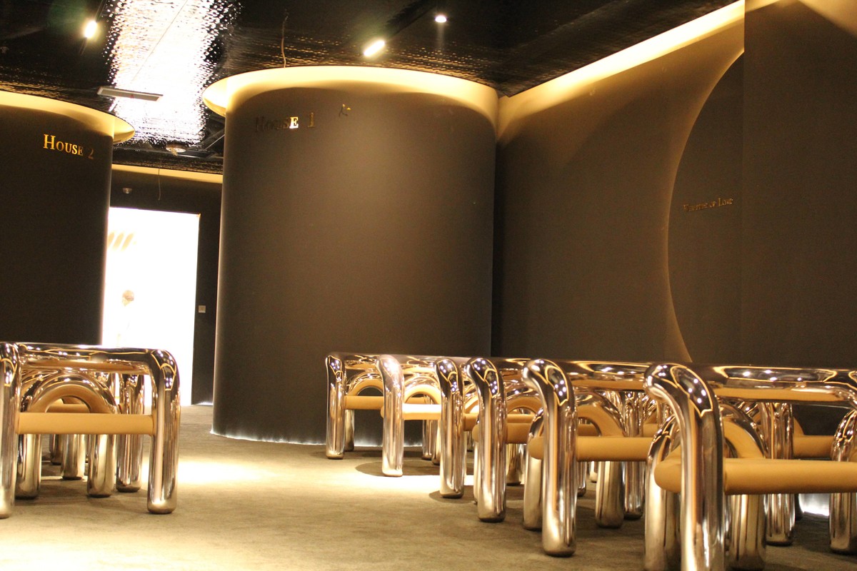 继续向里走,步入一段由全镜面组成的“万花筒”走廊,象征生活的千姿百态、缤纷多彩;穿过“万花筒”,是全黑色设计的婚姻辅导服务区、自助服务区等,新人们将在这里体验“婚前一课”,还有为新人们准备的“私密对话”环节——在暗黑色的圆形小间内,在成为“合法夫妻”前的一刻,把你们的悄悄话、私密话说完道尽;最后抵达的是办证厅,形成鲜明对比的是,这里采用暖色调布局,呈现温馨的氛围。