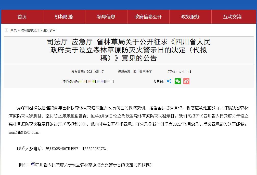 5月17日,四川省司法厅、省应急厅、省林草局发布公告,面向社会公开征求《四川省人民政府关于设立森林草原防灭火警示日的决定(代拟稿)》的意见,征求意见截止时间为5月24日。反馈意见请发送至邮箱:scsfjb@126.com。