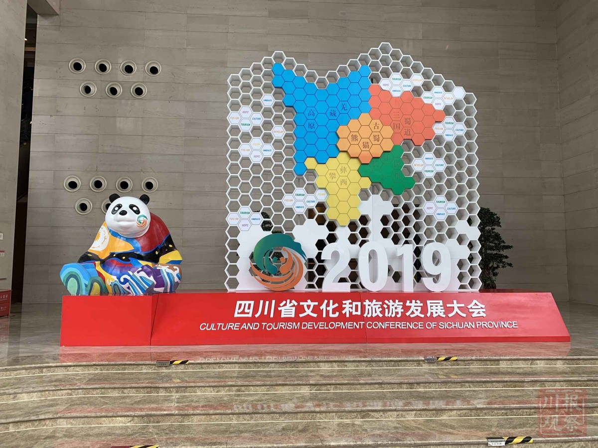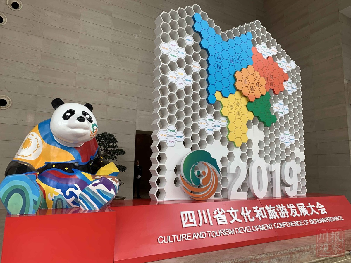 4月29日,四川省文化和旅游发展大会现场,以白色为基地的蜂窝造型装置吸引了不少参会者的目光,嘉宾代表们不时走上前去对装置上的文字一探究竟,并合影留恋。