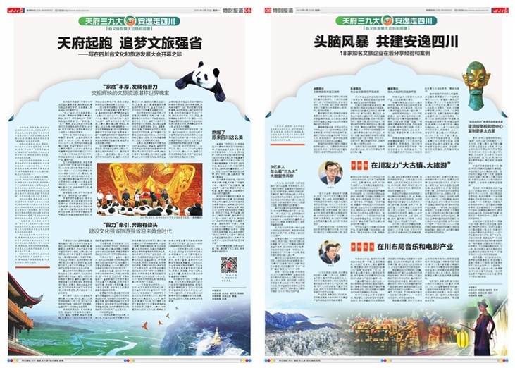 今天的四川日报,推出两个整版的省文旅发展大会特别报道《天府三九大 安逸走四川》,梳理四川文旅发展的成就与经验,也探寻世界各地文旅融合的思路与智慧。