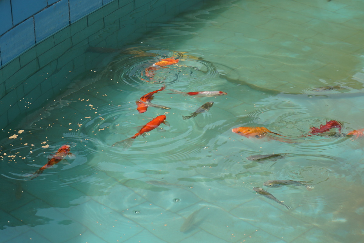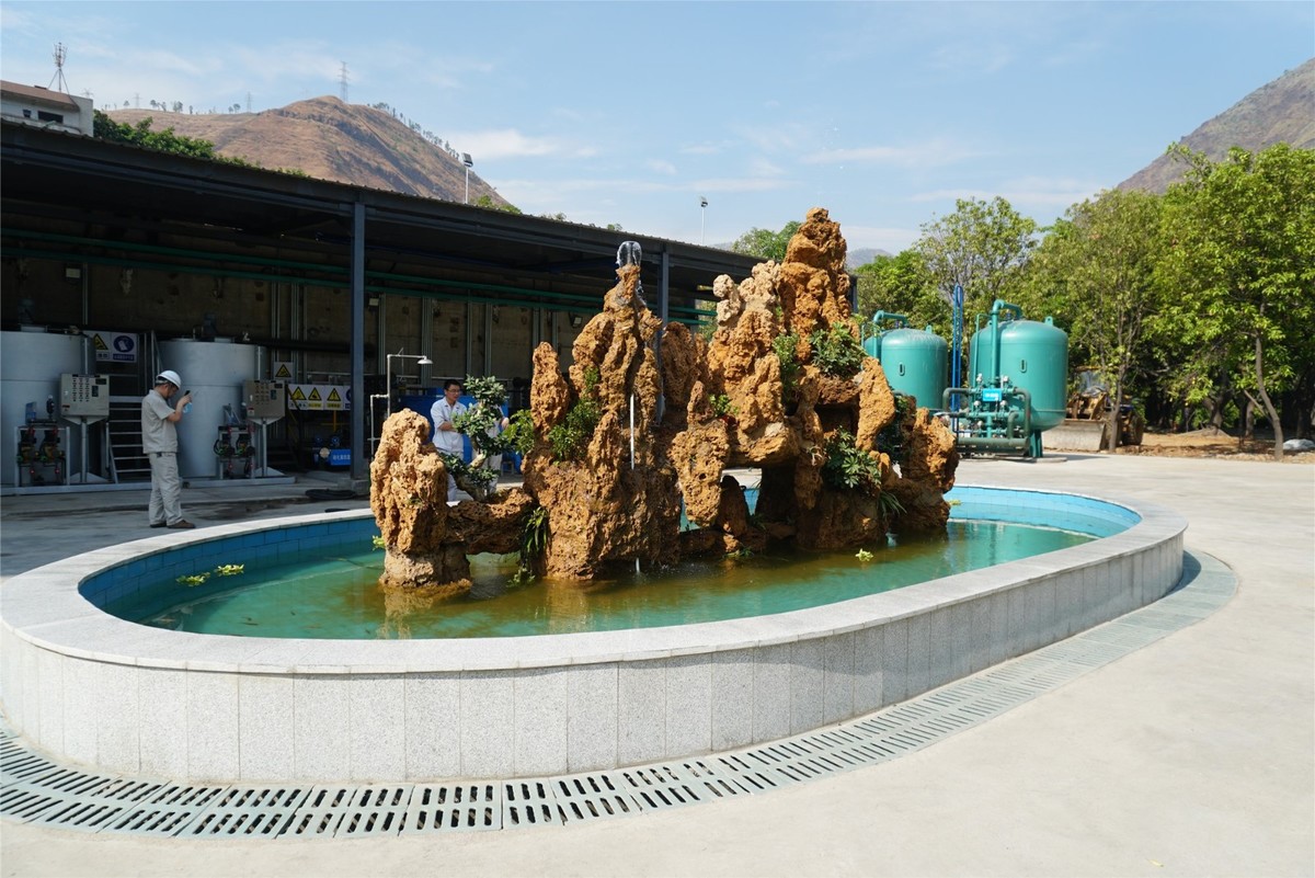 假山、绿水,5月19日,在攀钢集团攀枝花钢钒有限公司内的冷轧废水处理系统旁,一汪池塘里红黑两色观赏鱼结伴成群,自在游动。
