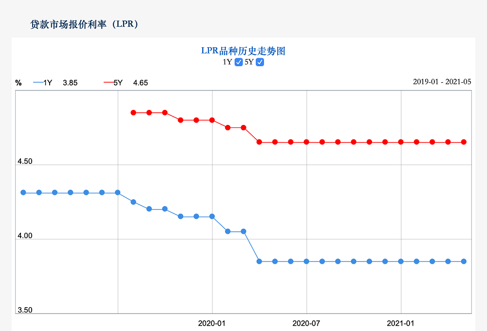 5月20日,最新一期的LPR出炉。中国人民银行授权全国银行间同业拆借中心公布,2021年5月20日贷款市场报价利率(LPR)为:1年期LPR为3.85%,5年期以上LPR为4.65%。以上LPR在下一次发布LPR之前有效。