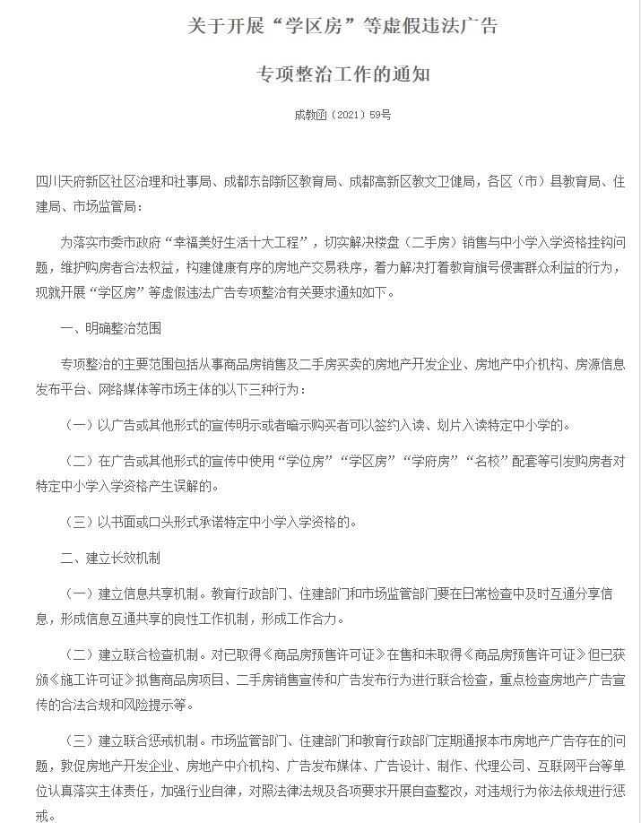为落实市委市政府“幸福美好生活十大工程”,切实解决楼盘(二手房)销售与中小学入学资格挂钩问题,维护购房者合法权益,构建健康有序的房地产交易秩序,着力解决打着教育旗号侵害群众利益的行为,5月20日,成都市教育局、成都市住房和城乡建设局及成都市市场监督管理局联合发布《关于开展“学区房”等虚假违法广告专项整治工作的通知》(以下简称《通知》),将联合开展“学区房”等虚假违法广告专项整治。