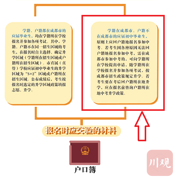 四川日报全媒体民情记者登陆成都市教育局官方网站查询到,根据其公布的2021年成都市中考报名相关规定,学籍在成都市、户籍不在成都市的应届初中毕业生需在成都市参加中考的,可向学籍所在学校提出申请,随学籍所在学校报名并参加各项考试,按成都市招生政策规定升学。若考生要在考后回户籍所在地升学,应在报名前咨询户籍所在地中考升学政策。