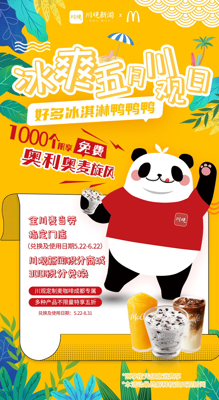 使用规则:川观新闻用户在麦当劳指定门店任意消费后,出示川观新闻积分商城兑换记录,即可免费领取1个麦当劳奥利奥麦旋风。