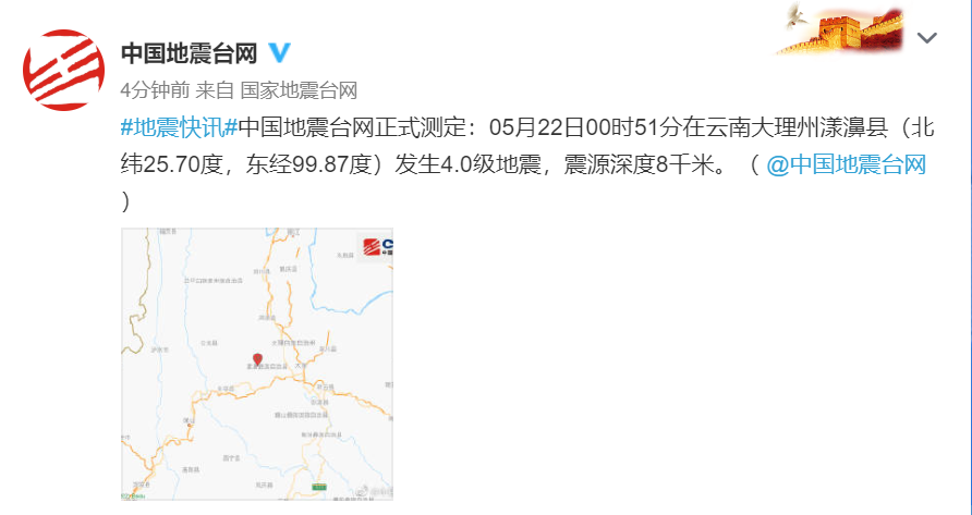 中国地震台网正式测定:05月22日00时51分在云南大理州漾濞县(北纬25.70度,东经99.87度)发生4.0级地震,震源深度8千米。