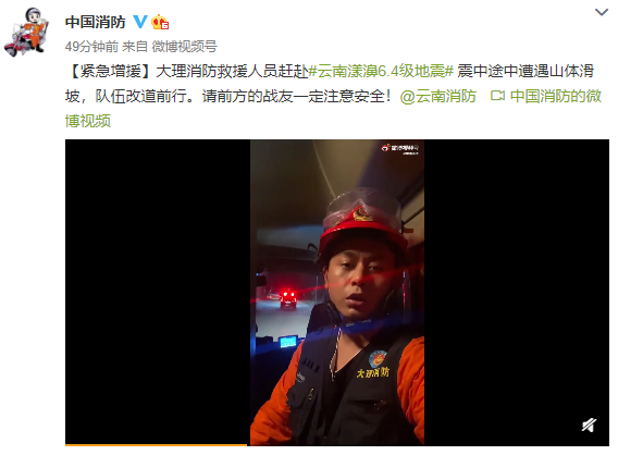 据@中国消防:大理消防救援人员赶赴云南漾濞6.4级地震震中途中遭遇山体滑坡,队伍改道前行。请前方的战友一定注意安全!