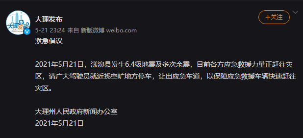 紧急倡议2021年5月21日,漾濞县发生6.4级地震及多次余震,目前各方应急救援力量正赶往灾区,请广大驾驶员就近找空旷地方停车,让出应急车道,以保障应急救援车辆快速赶往灾区。