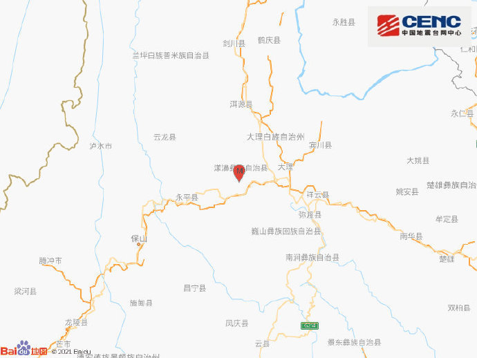 中国地震台网正式测定:05月21日21时21分在云南大理州漾濞县(北纬25.63度,东经99.92度)发生5.6级地震,震源深度10千米。