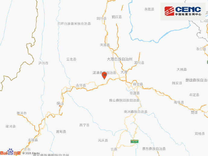 中国地震台网正式测定:05月21日21时56分在云南大理州漾濞县(北纬25.64度,东经99.95度)发生4.9级地震,震源深度8千米。