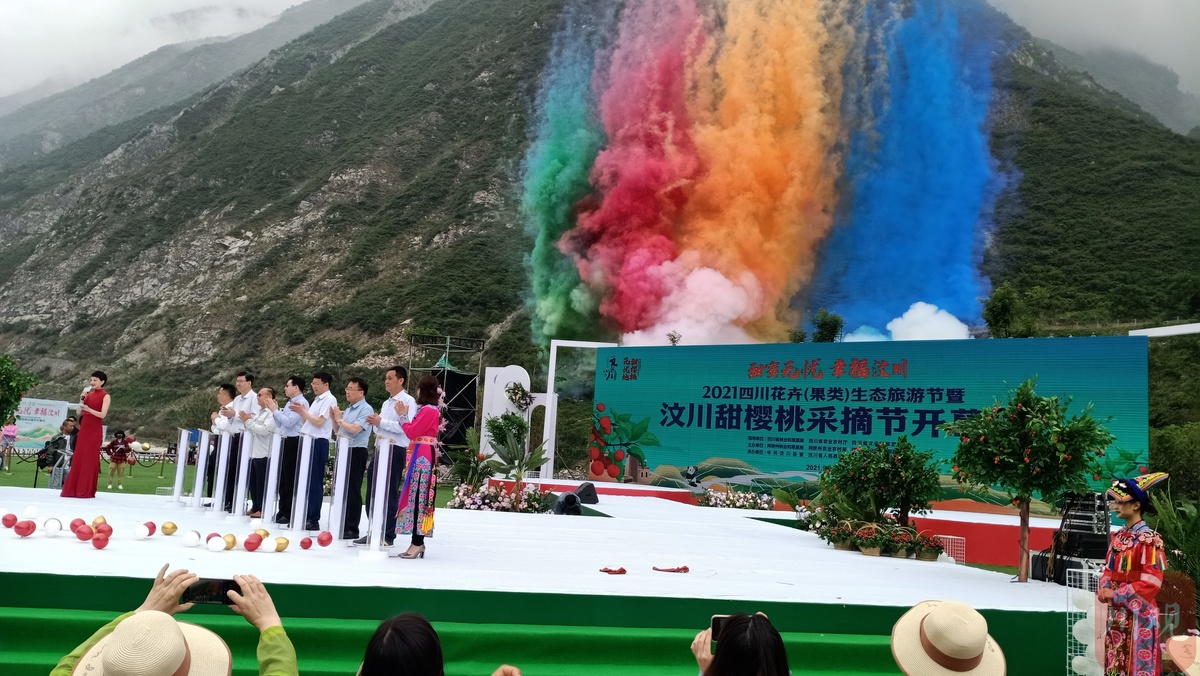 正值甜樱桃批量上市之际,在“中国大樱桃之乡”的汶川县,随处可见果农丰收的喜庆与甜蜜。5月22日,2021四川花卉(果类)生态旅游节暨汶川甜樱桃采摘节在该县绵虒三声音乐广场举行开幕式。